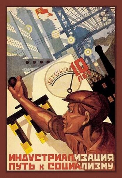 10 Liet (10 Years), a Constructivist poster painted by A. Vedeneev, commemorates the tenth anniversary of the Soviet Socialist Revolution. Created during a time of immense historical significance, this artwork captures the spirit of industrialism and progress. In the composition, a worker throws a switch, illuminating employment and production. The bold text declares, “Industrialism is the road to socialism.” Vedeneev’s use of stark lines, geometric shapes, and strong contrasts aligns with the Constructivist movement-a style that celebrated revolutionary ideals and sought to integrate art with everyday life. Through 10 Liet (10 Years), Vedeneev pays homage to the transformative power of the Soviet Revolution, emphasizing the role of industry in shaping a new society.