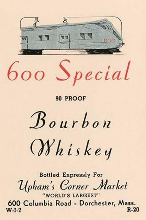 An early bottle label for a whiskey featuring a futuristic looking train.Unknown Date/USA