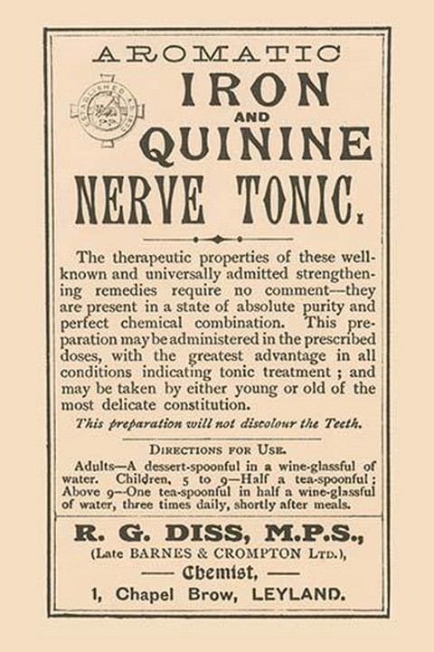 A 1920’s pharmacy bottle label. Many of these were quack cures and the main ingredient often was alcohol.1920/USA