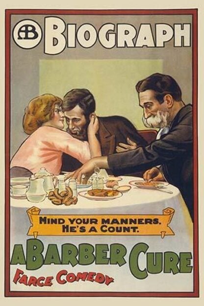 A Barber Cure’ shows a woman whispering into a man’s ear as an older man reaches for food on the table. This is a silent era film poster.1913/USA