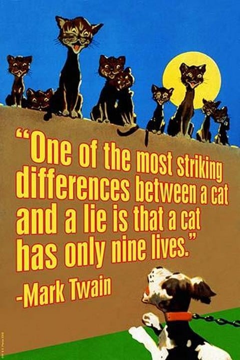 One of the most striking differences between a cat and a lie is that a cat has only nine lives. Mark Twain.2008/USA