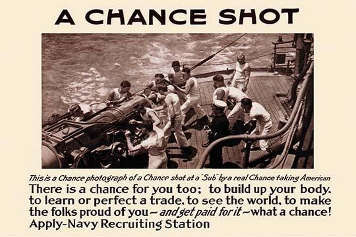 A chance shot This is a chance photograph of a chance shot at a ‘sub’ by a real chance taking American. There is a chance for you too; to build up your body, to learn or perfect a trade, to see the world, to make the folks proud of you-and get paid for it-what a chance! ; Apply-Navy Recruiting Station.1914/USA