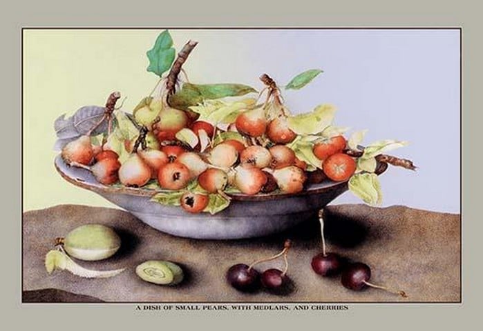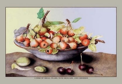 A Dish of Small Pears With Medlars and Cherries by Giovanna Garzoni – Posters and prints on paper or canvas by standard digital or deluxe giclee printing.