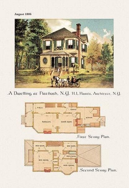 American Architecture of the Victorian Period with an illustration of the home’s exterior and a two floor architectural plan and layout1886/USA