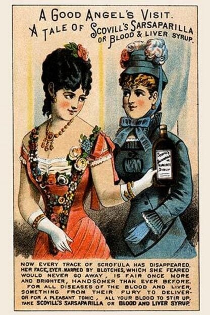 A Victorian medical trade card for a ‘quack’ medical cure for a panacea of conditions. The card shows two women smiling with a bottle of the medicine. A story below tells in rhyme a tale of how great the cure is. The effects are for blood and liver and also scrofula.1890/USA