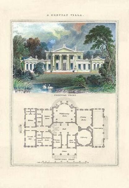 Cottages & Villas of the English Countryside in the adaptation from foreign influences in design with a painting of the home and a basic first floor plan1852/Britain
