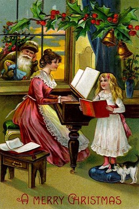 Father Christmas, Santa Claus, looks in the window of a home. Inside a woman plays the piano and her daughter sings a Christmas melody. A kitten rubs against the girls leg in this idealic scene replete with holly berries and bells.Unknown Date/USA