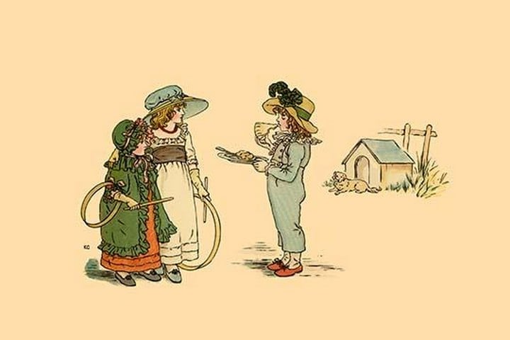 Taken from the book ‘A Apple Pie: An Old-Fashioned Alphabet Book’ published in London in 1886, this is a page illustrating an old nursery rhyme. The author was Kate Greenaway (Catherine Greenaway) (1846-1901) was an English children’s book illustrator and writer. She was very well respected as an artist. Her special talent was the ‘Kate Greenaway’ children, all of them little girls and boys too young to be put in trousers, according to the conventions of the time, were dressed in her own versions of late eighteenth century and Regency fashions: smock-frocks and skeleton suits for boys, high-waisted pinafores and dresses with mobcaps and straw bonnets for girls.1886/UK