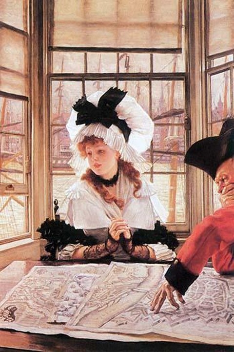 A colonial man places his hand on a city map which is spread on the table. Meanwhile, a young girl in a bonnet clasps her hands as she looks over his recounting some story. The model is Kathleen Newton, muse and mistress of painter James Jacques Tissot.1865/France