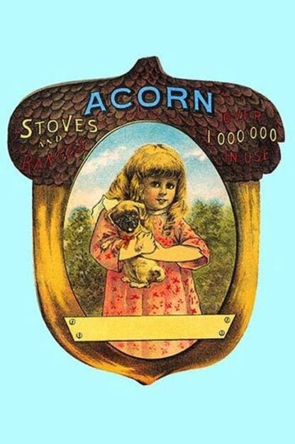 Advertisement for Acorn Stoves and Ranges showing the portrait of a young girl holding a puppy in oval with blank nameplate. Includes a wood engraved illustration of the ‘Imperial Acorn Range’ and letterpress text on the verso. Printed on paper designed and shaped like an acorn. ‘The imperial acorn range-for burning bituminous coal or wood / Ferguson, Albany’1886/USA