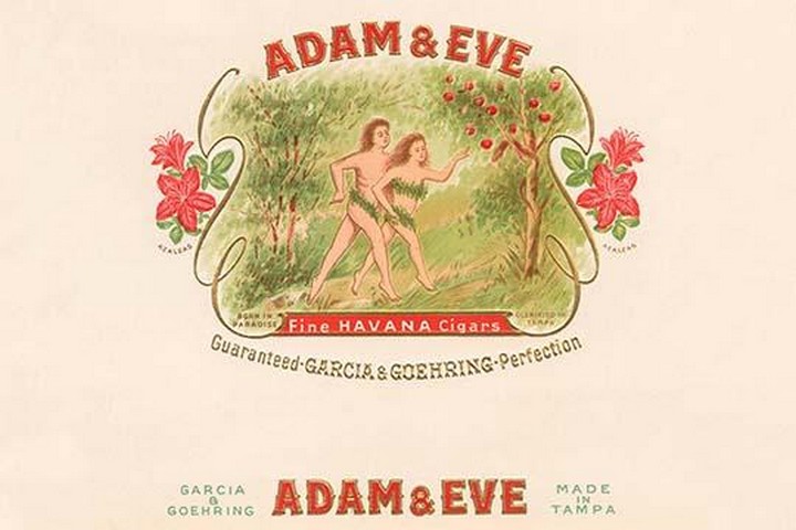 A cigar box label featuring the biblical couple Adam and Eve leaving the garden of Eden. A clever name because it associated the perfect garden with tobacco leaves to become the best smoke.Unknown Date/USA