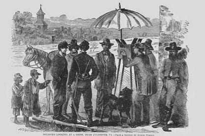 Frank Leslie was a prominent 19th-century American illustrator, publisher, and editor. He started as an illustrator for popular periodicals and established his own publishing company, “Frank Leslie’s Illustrated Newspaper,” which became one of the most successful and influential newspapers of its time. Leslie was also a pioneer in the use of photographs in journalism and established a photographic studio to create original images for his newspaper. He wrote several books and plays and was an important figure in the development of American media, shaping the way news was reported and disseminated. He died in 1880, leaving a lasting legacy.African American children & Soldiers are amazed by Photographic camerasUnknown Date/USA