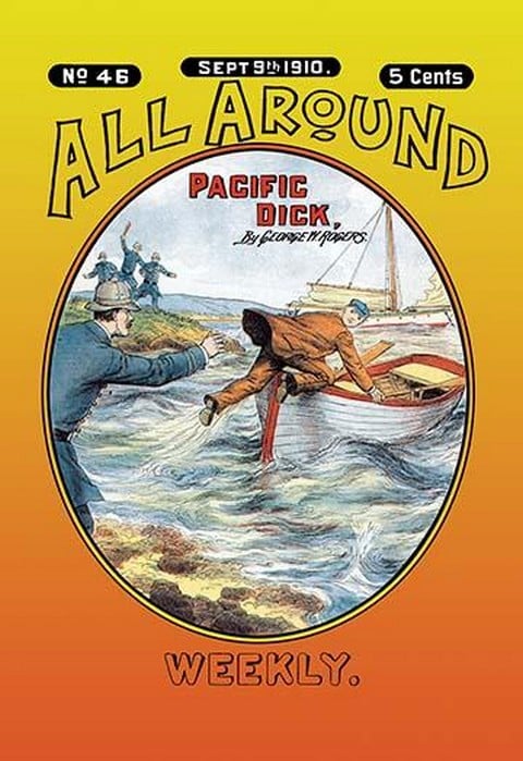 Frank Tousey (1853-1902) was among the top five publishers of dime novels in the late 19th-century and early 20th-century. Based in New York, his sensationalism drew a large audience of youth, hungry for scenes of daring and tormented heroes and damsels in distress. Of particular notice in his approach to the ‘blood and thunder’ genre were the vivid cover illustrations of his dime novels, which were consistently larger and more thrilling than previous publications. Although focused on fictional weeklies, Tousey managed a variety of materials over time, including some handbooks, gossip sheets, and even a newspaper on current events in the Spanish-American War. “All Around Weekly” was a nickel weekly publication reprinting material from “Boys Star Library” and ran from from October 29, 1909, to March 10, 1911. Each issue featured 32 pages with colored pictorial covers and contained a variety of long, interesting stories. These stories were written by different authors and illustrated by expert artists. The publisher aimed to provide engaging content that couldn’t be found elsewhere. The blurb promised “a new story every week” and “fine illustrations.” Although the series ended after 72 issues, it left a mark as a periodical that catered to diverse tastes and entertained readers with thrilling adventures, mysteries, and more.