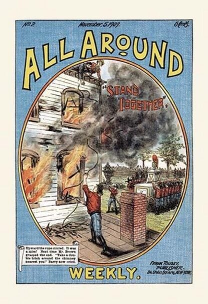 Frank Tousey (1853-1902) was among the top five publishers of dime novels in the late 19th-century and early 20th-century. Based in New York, his sensationalism drew a large audience of youth, hungry for scenes of daring and tormented heroes and damsels in distress. Of particular notice in his approach to the ‘blood and thunder’ genre were the vivid cover illustrations of his dime novels, which were consistently larger and more thrilling than previous publications. Although focused on fictional weeklies, Tousey managed a variety of materials over time, including some handbooks, gossip sheets, and even a newspaper on current events in the Spanish-American War. “All Around Weekly” was a nickel weekly publication reprinting material from “Boys Star Library” and ran from from October 29, 1909, to March 10, 1911. Each issue featured 32 pages with colored pictorial covers and contained a variety of long, interesting stories. These stories were written by different authors and illustrated by expert artists. The publisher aimed to provide engaging content that couldn’t be found elsewhere. The blurb promised “a new story every week” and “fine illustrations.” Although the series ended after 72 issues, it left a mark as a periodical that catered to diverse tastes and entertained readers with thrilling adventures, mysteries, and more.