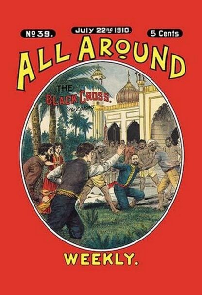 Frank Tousey (1853-1902) was among the top five publishers of dime novels in the late 19th-century and early 20th-century. Based in New York, his sensationalism drew a large audience of youth, hungry for scenes of daring and tormented heroes and damsels in distress. Of particular notice in his approach to the ‘blood and thunder’ genre were the vivid cover illustrations of his dime novels, which were consistently larger and more thrilling than previous publications. Although focused on fictional weeklies, Tousey managed a variety of materials over time, including some handbooks, gossip sheets, and even a newspaper on current events in the Spanish-American War. “All Around Weekly” was a nickel weekly publication reprinting material from “Boys Star Library” and ran from from October 29, 1909, to March 10, 1911. Each issue featured 32 pages with colored pictorial covers and contained a variety of long, interesting stories. These stories were written by different authors and illustrated by expert artists. The publisher aimed to provide engaging content that couldn’t be found elsewhere. The blurb promised “a new story every week” and “fine illustrations.” Although the series ended after 72 issues, it left a mark as a periodical that catered to diverse tastes and entertained readers with thrilling adventures, mysteries, and more.