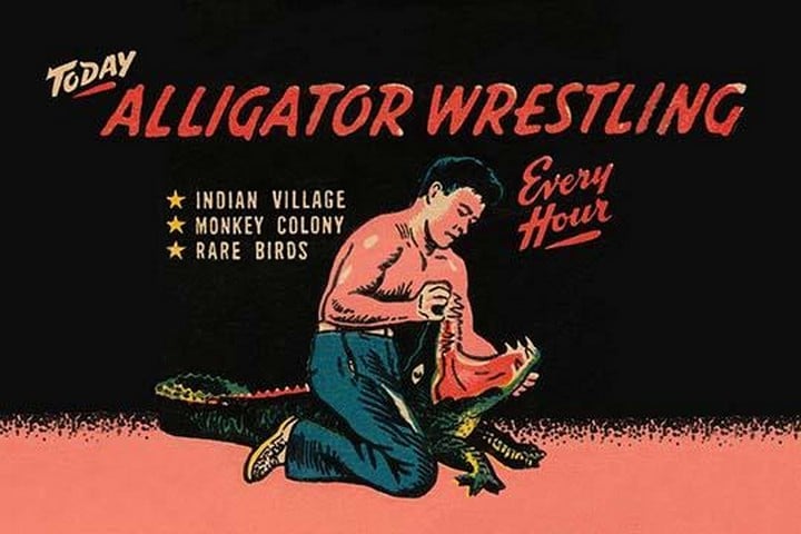 Henry Nelson, world’s champion alligator wrestler, gives daily exhibitions of this ancient Seminole sport, at Tropical Hobbyland Indian Village, N. W. 27th Avenue at 15th Street, Miami. The pit at Tropical Hobbyland contains fifty alligators and a dozen crocodiles, yet Henry will go in the water with them entirely unarmed.1930/USA
