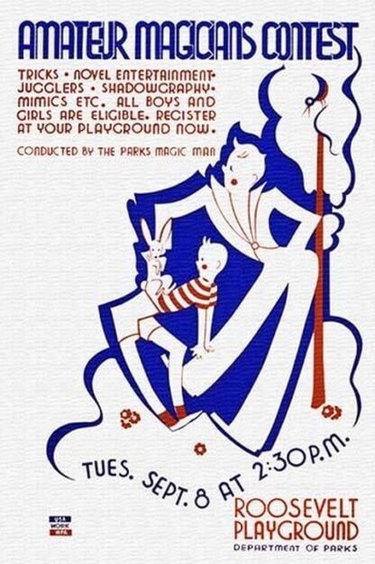 Amateur magicians contest, Roosevelt Playground Tricks, novel entertainment, jugglers, shadowgraphy, mimics, etc. : All boys and girls are eligible : Register at your playground now1936/USA