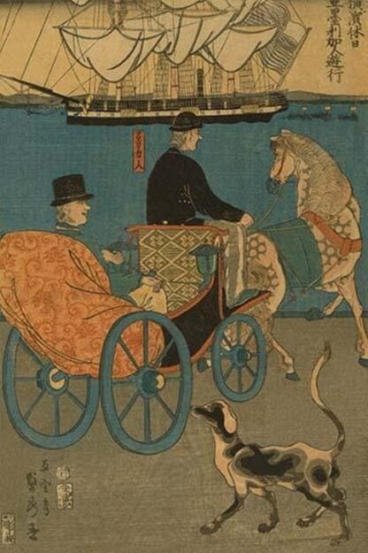 Japanese print shows an American man riding in a carriage along the shoreline in Yokohama, Japan; a dog in the foreground and an American ship in the background. Done by Utagawa Sadahide (1807-1873) in 1861.1861/Japan