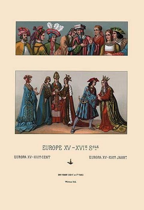 An Assortment of Fifteenth Century French Costumes by Auguste Racinet – Posters and prints on paper or canvas by standard digital or deluxe giclee printing.