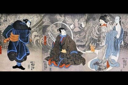 A Japanese triptych of ghosts, a monster cat, and two characters of legend.Unknown Date/Japan