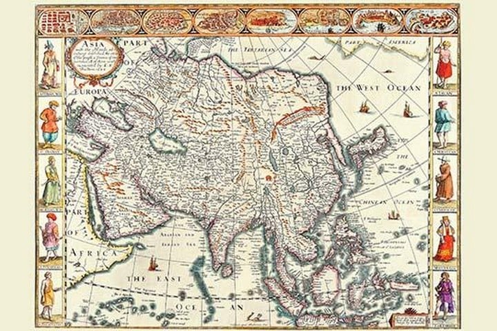 English cartographer, historian and antiquary. Born Farndon in Cheshire and a member of the guild of Merchant Tailors. His subsequent cartographic career evolved from his interests as both historian and antiquary. Speed is of considerable importance in the history of English cartography in being the author of two major folio Atlases. The Theatre of the Empire of Great Britaine, an Atlas of the British Isles and its regions, first published in London in 1611. This Atlas is best known for the fine county maps, modeled on the earlier Elizabethan surveys of Christopher Saxton and John Norden, which include armorials, local vignettes, and inset town plans (many of which Speed claimed to have surveyed at first hand himself). His second Atlas, the first World Atlas by an Englishman, entitled A Prospect of the Most Famous Parts of the World, first appeared in London in 1627. It took as its model the Dutch carte-a-figure genre (maps with top and side borders panels of town views and native inhabitants) to portray the countries of the then-known World.1626/London, England