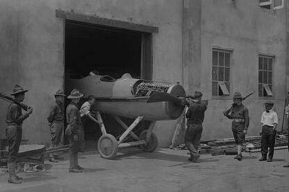 At college point aircraft manufacturing plant in Queens, New York, a Fighter sans wings is moved out the plant door for finally assembly and shipment to Europe to fight in the Great War1917/USA