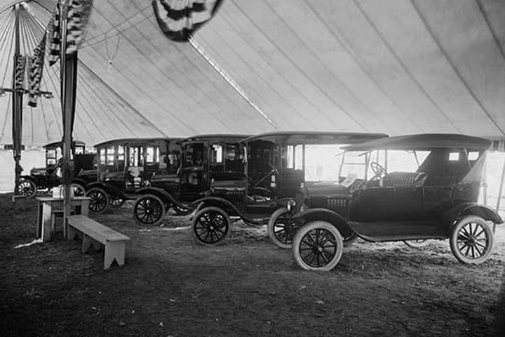 Automobiles & Trucks on Display in Tent Under American Flag Banners1921/USA