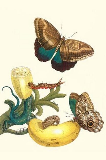 Banana Plant with Teucer Giant Owl Butterfly and a Rainbow whiptail Lizard by Maria Sibylla Merian – Posters and prints on paper or canvas by standard digital or deluxe giclee printing.