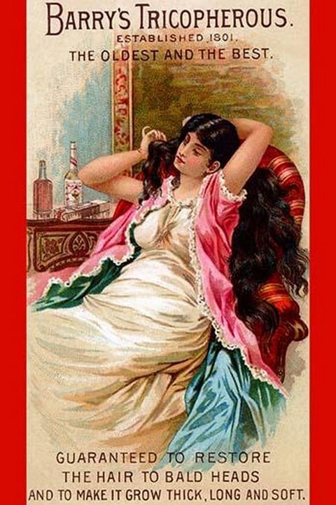 A Victorian trade card for a ‘medicine’ that is guaranteed to restore the hair to bald heads and to make it grow thick, long, and soft. In reality, these quack concoctions were mostly alcohol or poisons like lead.1890/USA