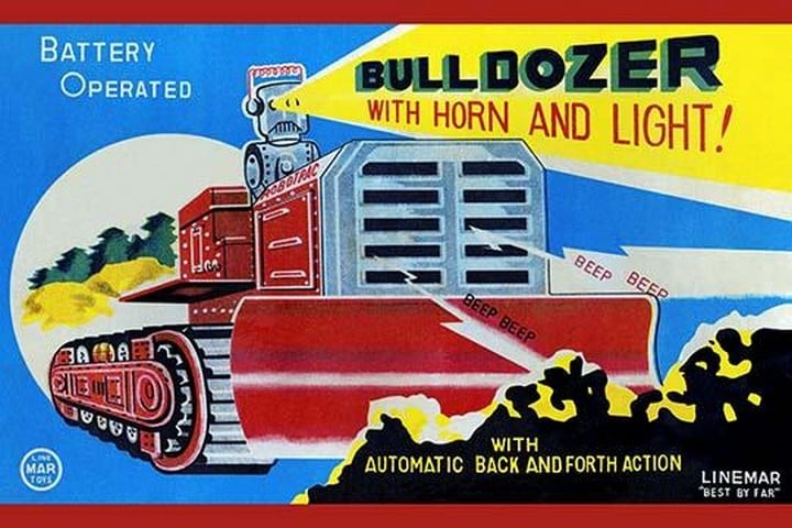Battery Operated Bulldozer with Horn and Light – Posters and prints on paper or canvas by standard digital or deluxe giclee printing.