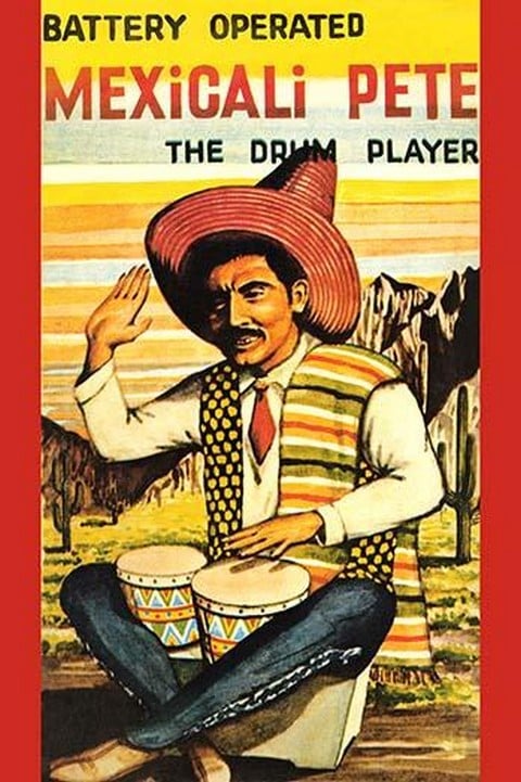 A man in traditional Mexican clothing beats on bongo drums. This is the art from a tin toy in the 1950’s.1950/Japan