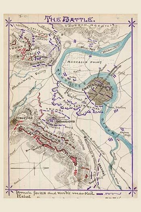 After a day of fierce fighting ‘above the clouds’ on November 24, the Confederates retained a tenuous hold on Lookout Mountain. In this image the focus has shifted to Missionary Ridge. Arrows show the direction of attack as the Union forces under Thomas broke through the Confederate defenses, sending Bragg’s army in retreat.1864/USA