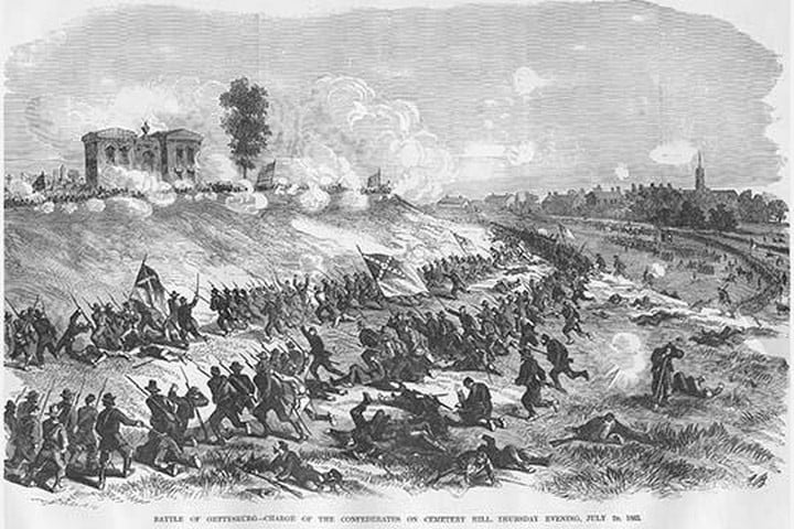 Frank Leslie was a prominent 19th-century American illustrator, publisher, and editor. He started as an illustrator for popular periodicals and established his own publishing company, “Frank Leslie’s Illustrated Newspaper,” which became one of the most successful and influential newspapers of its time. Leslie was also a pioneer in the use of photographs in journalism and established a photographic studio to create original images for his newspaper. He wrote several books and plays and was an important figure in the development of American media, shaping the way news was reported and disseminated. He died in 1880, leaving a lasting legacy.Battle of Gettysburg at Cemetery HillJuly 2, 1863/USA