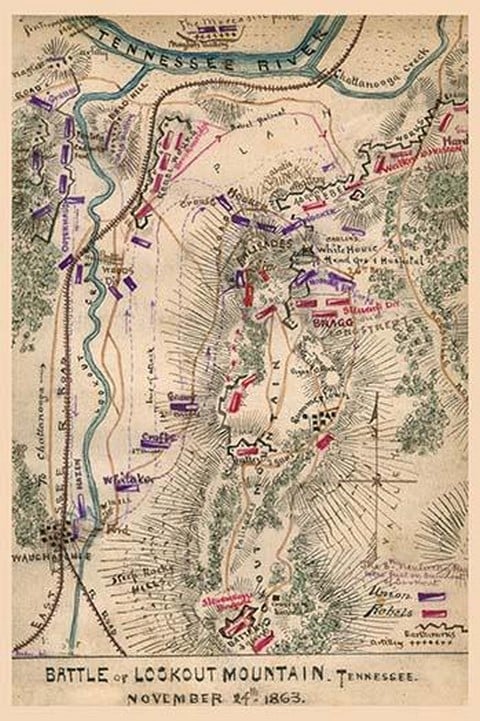 Oriented with the Tennessee River to the top and the East Tennessee Railroad to the east, image gives details of the difficult terrain surrounding the Confederate position on Lookout Mountain. Dotted lines show the directions of the Union attack and the Confederate retreat.1863/USA