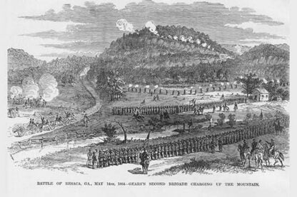 Frank Leslie was a prominent 19th-century American illustrator, publisher, and editor. He started as an illustrator for popular periodicals and established his own publishing company, “Frank Leslie’s Illustrated Newspaper,” which became one of the most successful and influential newspapers of its time. Leslie was also a pioneer in the use of photographs in journalism and established a photographic studio to create original images for his newspaper. He wrote several books and plays and was an important figure in the development of American media, shaping the way news was reported and disseminated. He died in 1880, leaving a lasting legacy.Battle of Resaca, Georgia-Geary’s 2nd BrigadeMay 14, 1864/USA