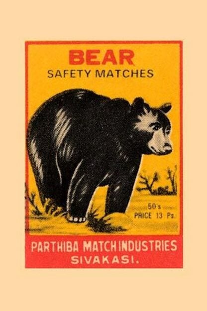 Thousands of companies manufactured matches worldwide and used a variety of fancy labels to make their brand stand out. The match boxes had unusual topics but some were much prettier than others. Features a large black bear.Unknown Date/India