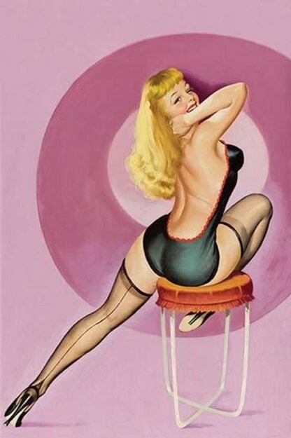Beautiful girl in high heels and one piece suit sits alluringly on a chair coming out her beautiful blonde hair.Peter Driben was an American pin-up artist, best known for his vibrant and often cheeky illustrations that were a staple of mid-20th century popular culture. Born in 1903 in Boston, Massachusetts, Driben’s work gained prominence during the 1930s and 1940s, a period often considered the golden age of pin-up art.Peter Driben’s pin-up art is characterized by its playful and light-hearted nature. His illustrations often featured glamorous and provocatively posed women, exuding a sense of confidence and allure. Driben had a knack for capturing the beauty and charm of the female form, using bold colors and dynamic compositions. His work was notable for its detailed and realistic rendering, combined with a slightly exaggerated, cartoonish quality that added a sense of fun and fantasy.Driben’s pin-ups were widely published in pin-up magazines such as **”Beauty Parade,” “Titter,” “Wink,” “Rogue,” and “Flirt.” He also created cover art for paperback books and calendars. His work contributed significantly to the visual culture of his time, influencing both contemporary and later artists in the genre. Driben’s pin-ups were part of a broader movement that included other famous pin-up artists like Alberto Vargas, Gil Elvgren, and George Petty. These artists collectively helped to define the aesthetic of the pin-up girl, which became an iconic symbol of mid-century American popular culture, especially during World War II when such imagery was used to boost morale among soldiers.1949/USA.