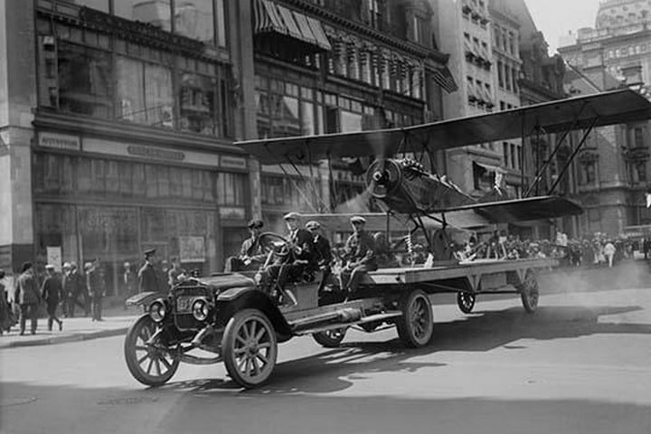 Biplane with spinning propeller is towed by an automobile down Fifth Avenue New York for July 4th ParadeUnknown Date/USA