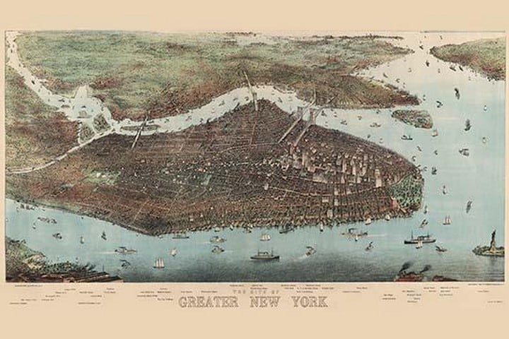 Bird’s-eye view of greater New York with Battery Park on the right and showing the boroughs of Bronx, Queens, Manhattan, Brooklyn, and Richmond, with the Hudson River in the foreground; prominent features and locations are listed below image.1905/USA