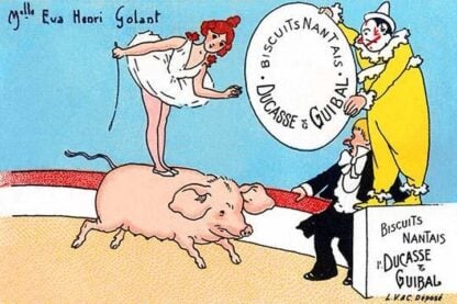 Advertising for biscuits showing a famous circus performer Madame Eva Henri Golant riding a pig. The BN Biscuit (or Biscuiterie Nantaise) is a French brand of biscuit, consisting of a filling, such as chocolate, sandwiched between two biscuits. It was launched in 1897.Unknown Date/France