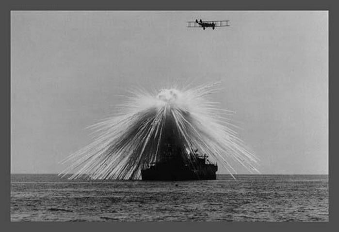 The USS Alabama never saw combat but served in WWI and beyond. In 1921 she became a dummy ship as the target of aerial bombs. These experiments were to convince the Navy of the need and usefulness of naval aviation.1921/USA