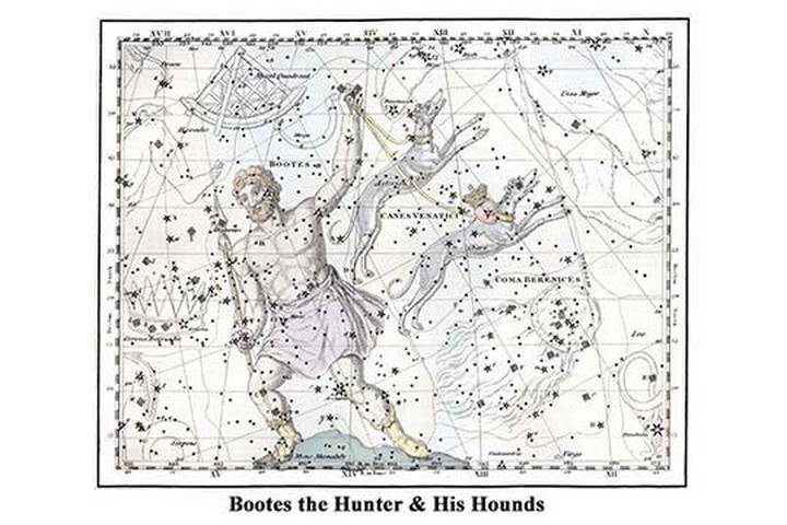 Bootes is the most ancient constellation in the sky. Indeed, it has been reconized by numerous cultures in slightly different forms. Even the Greeks were not clear on its history. The first reference to the name Bootes comes from ‘The Odyssey’ by Homer almost three millenia ago. He is called the Hunter and, with his Hounds (Canes Venatici), he eternally circles the Bears, Ursa Major and Ursa Minor, around the North Pole. In fact, the brightest star in Bootes is Arcturus, which can be loosely translated as ‘Bear Guard.’1822/London