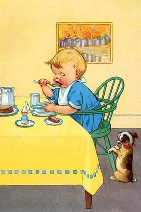 A little puppy begs at the side of the table as a little boy eats a healthy breakfast.1933/USA
