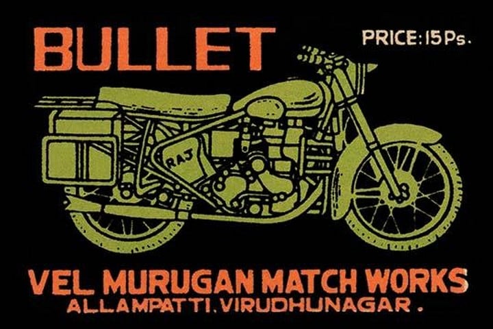 Thousands of companies manufactured matches worldwide and used a variety of fancy labels to make their brand stand out. The match boxes had unusual topics but some were much prettier than others. Pictured is a motorcycle with the word RAJ on the side.Unknown Date/India