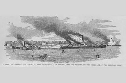 Frank Leslie was a prominent 19th-century American illustrator, publisher, and editor. He started as an illustrator for popular periodicals and established his own publishing company, “Frank Leslie’s Illustrated Newspaper,” which became one of the most successful and influential newspapers of its time. Leslie was also a pioneer in the use of photographs in journalism and established a photographic studio to create original images for his newspaper. He wrote several books and plays and was an important figure in the development of American media, shaping the way news was reported and disseminated. He died in 1880, leaving a lasting legacy.Burning Confederate Gunboats & Rams at New Orleans & Algiers on approach of the Federal FleetUnknown Date/USA