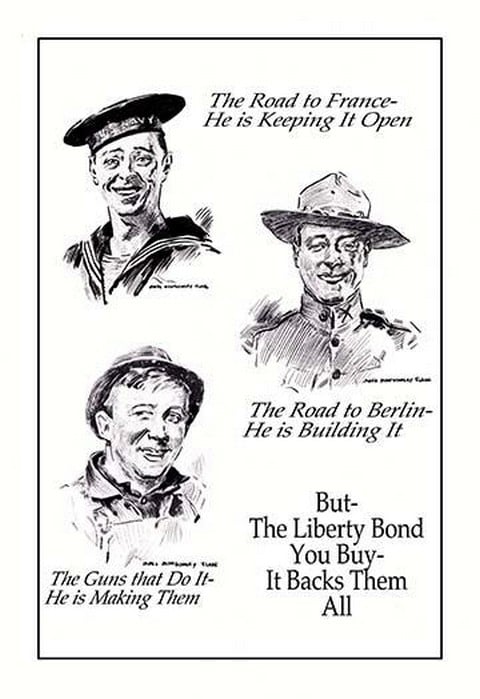 James Montgomery Flagg (1877-1960) was an American artist and illustrator. He is most famous for his war effort posters but he also work for magazines, did cartoons, and even paintings Three faces show the war effort in France, heading to Berlin, and building guns.1918/USA