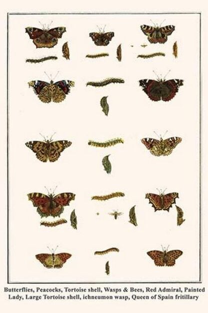Butterflies, Peacocks, Tortoise Shell, Wasps & Bees, Red Admiral, Painted Lady, Large Tortoise Shell, Ichneumon Wasp, Queen of Spain Fritillary by Albertus Seba – Posters and prints on paper or canvas by standard digital or deluxe giclee printing.