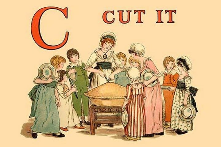 Taken from the book ‘A Apple Pie: An Old-Fashioned Alphabet Book’ published in London in 1886, this is a page illustrating an old nursery rhyme. The author was Kate Greenaway (Catherine Greenaway) (1846-1901) was an English children’s book illustrator and writer. She was very well respected as an artist. Her special talent was the ‘Kate Greenaway’ children, all of them little girls and boys too young to be put in trousers, according to the conventions of the time, were dressed in her own versions of late eighteenth century and Regency fashions: smock-frocks and skeleton suits for boys, high-waisted pinafores and dresses with mobcaps and straw bonnets for girls.1886/UK