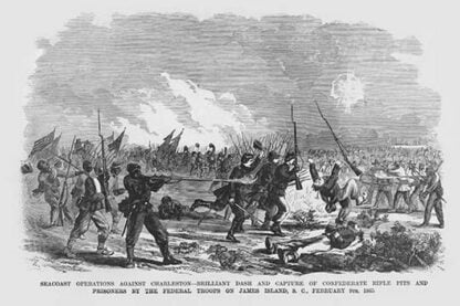 Frank Leslie was a prominent 19th-century American illustrator, publisher, and editor. He started as an illustrator for popular periodicals and established his own publishing company, “Frank Leslie’s Illustrated Newspaper,” which became one of the most successful and influential newspapers of its time. Leslie was also a pioneer in the use of photographs in journalism and established a photographic studio to create original images for his newspaper. He wrote several books and plays and was an important figure in the development of American media, shaping the way news was reported and disseminated. He died in 1880, leaving a lasting legacy.Capture of James IslandFebruary 9, 1865/USA