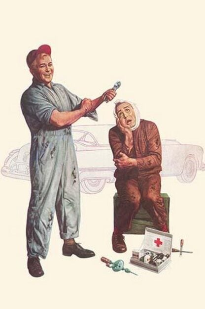 A woman cried in woe as a mechanical rolls up his sleeves to repair the woman’s car. Below a first aid kit is open.1950/USA